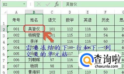这个时候勾选B2单元格,也就是需要冻结的下一行和下一列交叉的单元格,然后点选“视图”-“冻结窗格”-“冻结拆分窗格”,这样首行和首列就会同时被冻结了;
