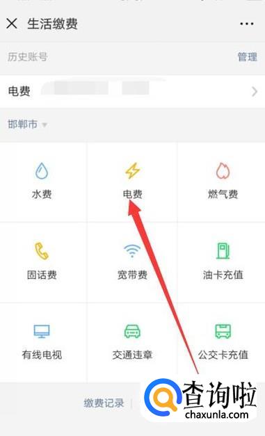 进入之后,即可看到缴费页面,点击“电费”,如图所示。