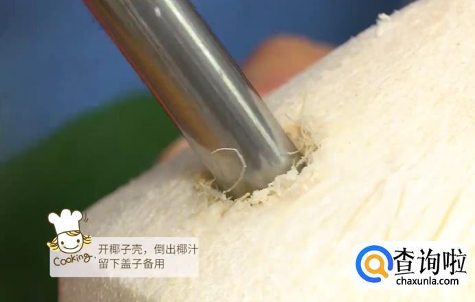 首先打开椰子壳,倒出椰汁,留下壳备用。