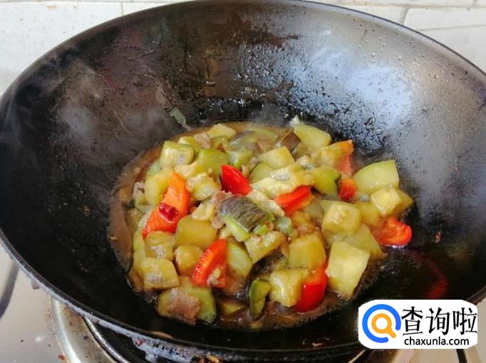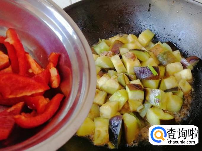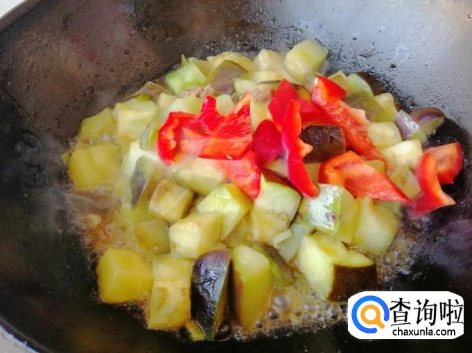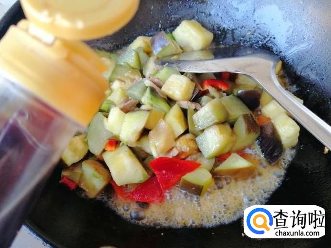 等茄子基本已变软时,加入备好的红菜椒,用铲子翻炒均匀,菜椒也能生吃,所以不用炒时间太长,那样容易营养流失,加入适量生抽。