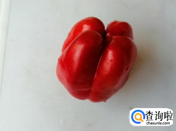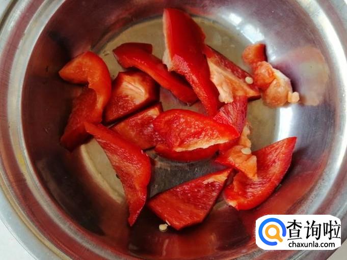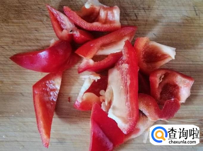 取新鲜的红色菜椒一个,用清水把红色菜椒洗净,然后把红菜椒放在菜板上,用刀切成菱形块或三角块,切好盛入容器中待用。