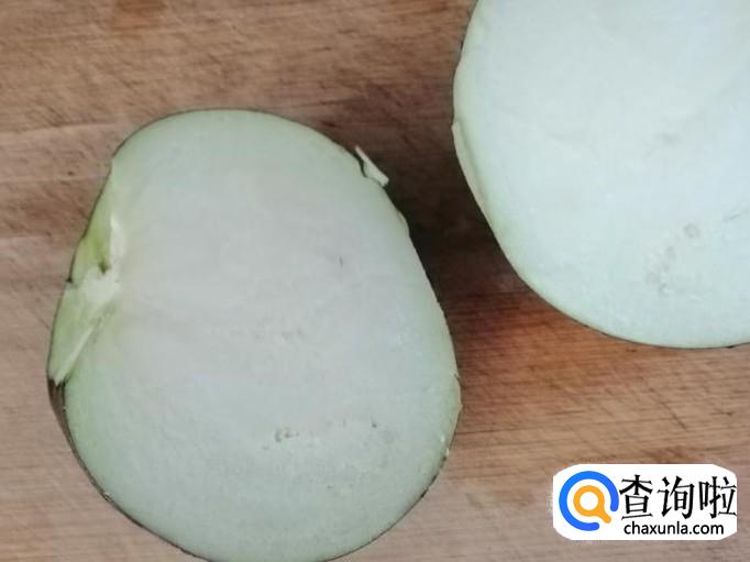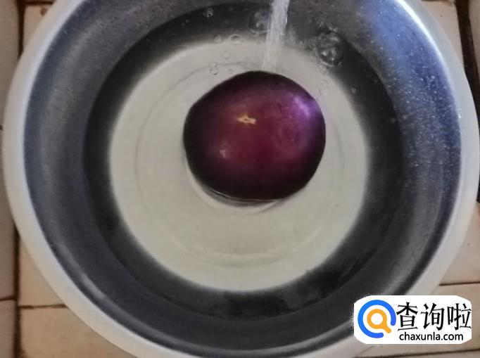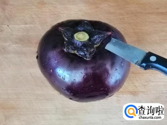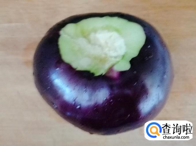 选用新鲜的圆茄子,用清水把圆茄子洗净,洗净茄子后用刀去掉茄子把,因为茄子把上有刺,小心扎手。