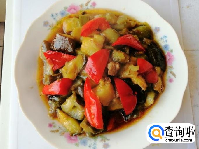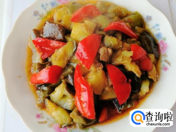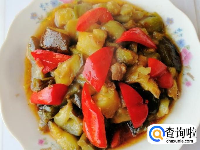 圆茄子一个,红色菜椒一个,适量葱和干红辣椒,适量熟肉,生抽、食盐适量