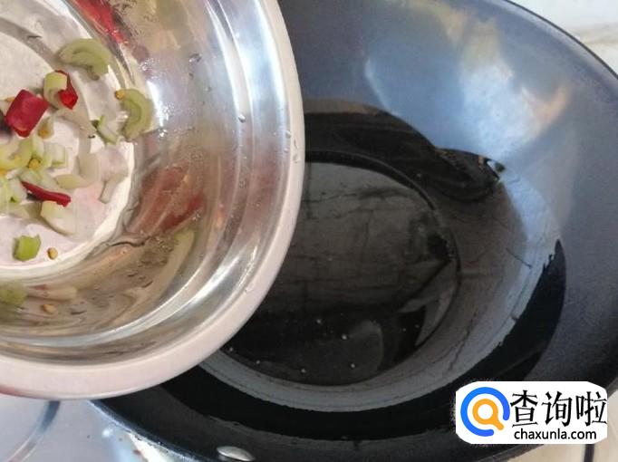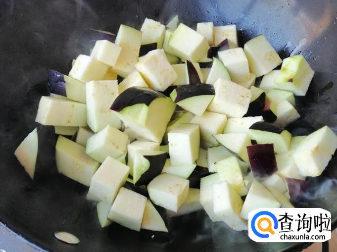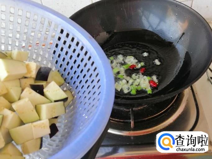 炒锅放油,油热后先放葱花和干辣椒炝锅,炒出香味后,加入备好的茄子块,用铲子把茄子块,快速翻炒均匀。