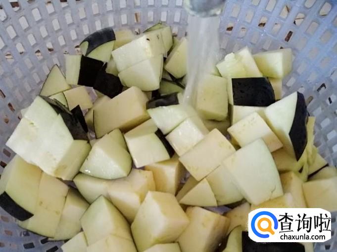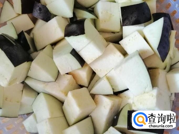 去掉茄子把后,用刀把茄子从中间切开一分为二,然后先切半个茄子,横着切成条,竖切成块,把切好的茄子块,过一下清水待用。
