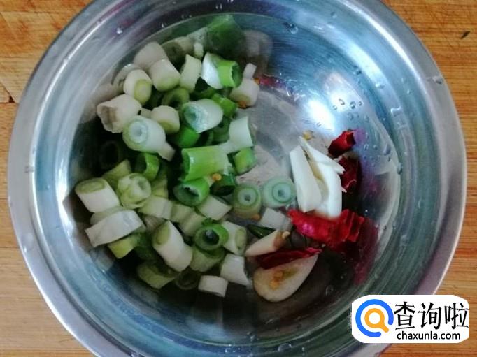 准备好适量熟猪肉待用,适量葱和干红辣椒,用清水洗净,把葱和干辣椒切好待用,喜欢吃辣味重的,可以多备几个干红辣椒。