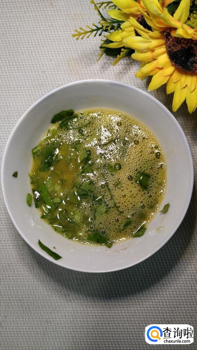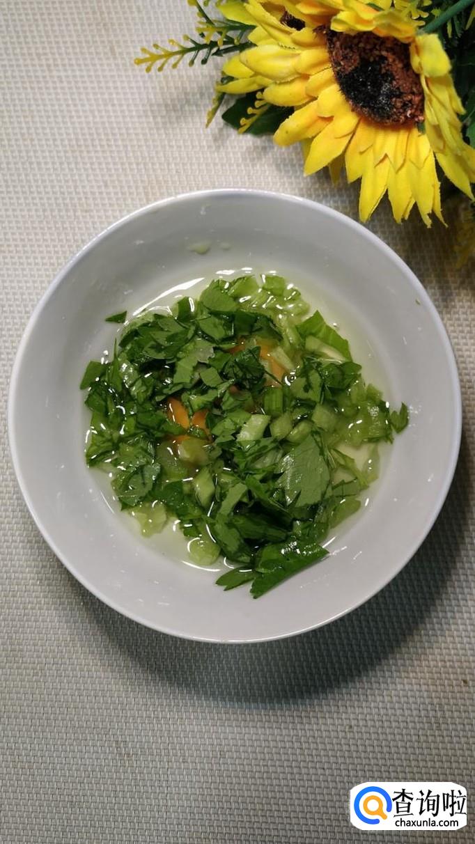 准备适量新鲜的芹菜,叶子不用去掉,将芹菜切碎后放入鸡蛋液中,搅拌均匀,备用。