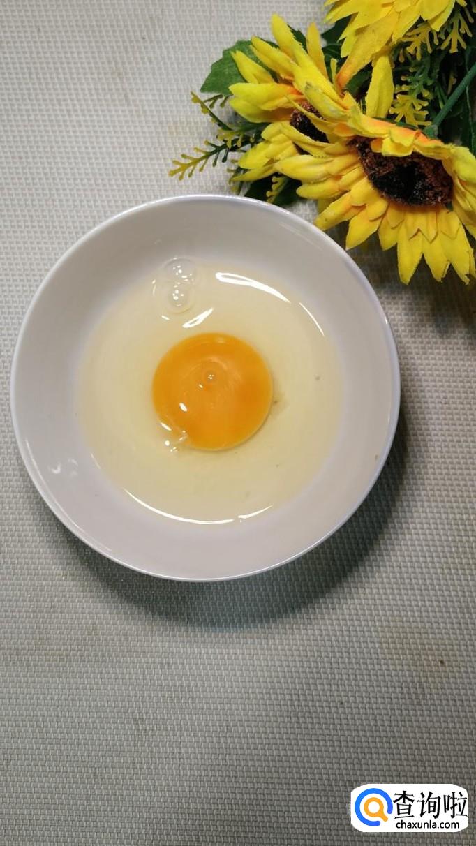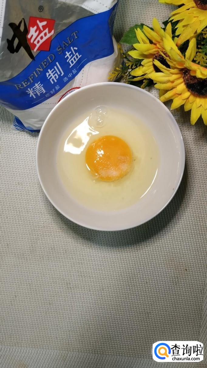碗中打入一个鸡蛋,加入适量盐和料酒,打散备用。
