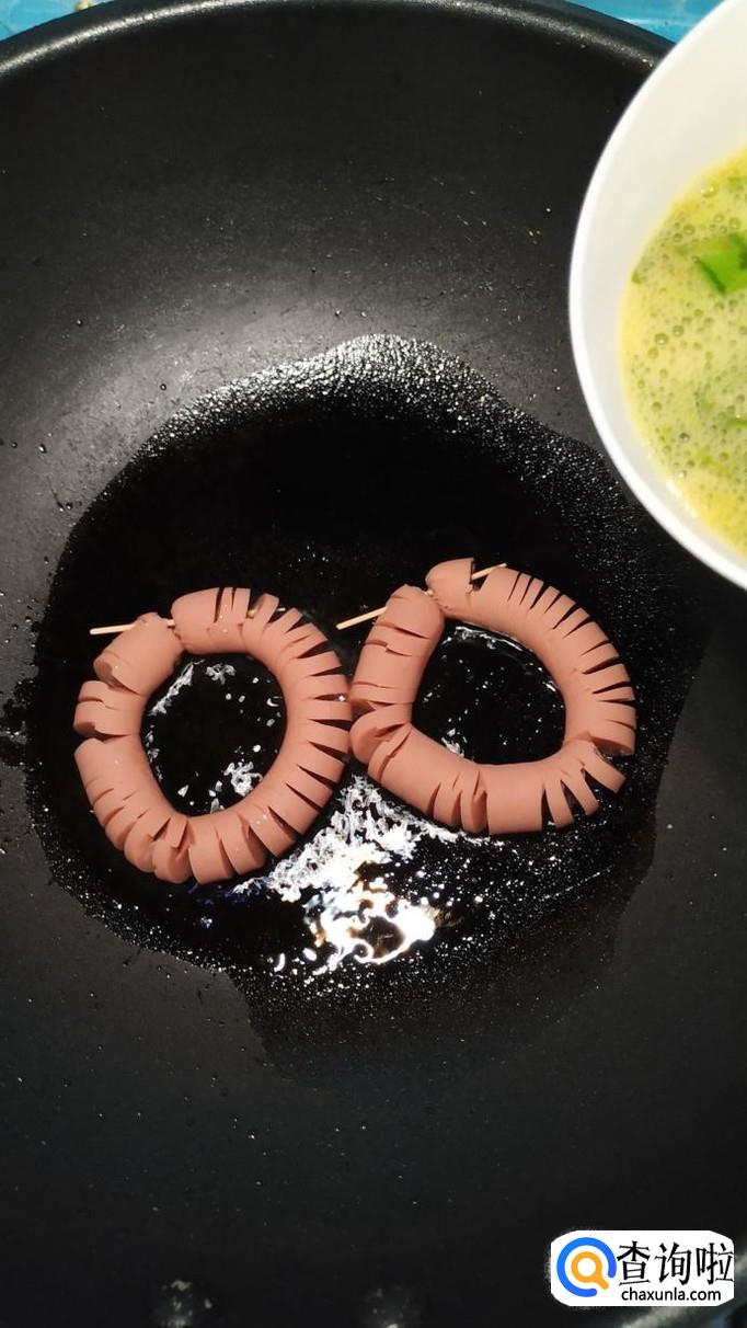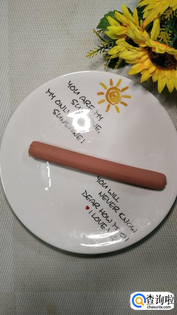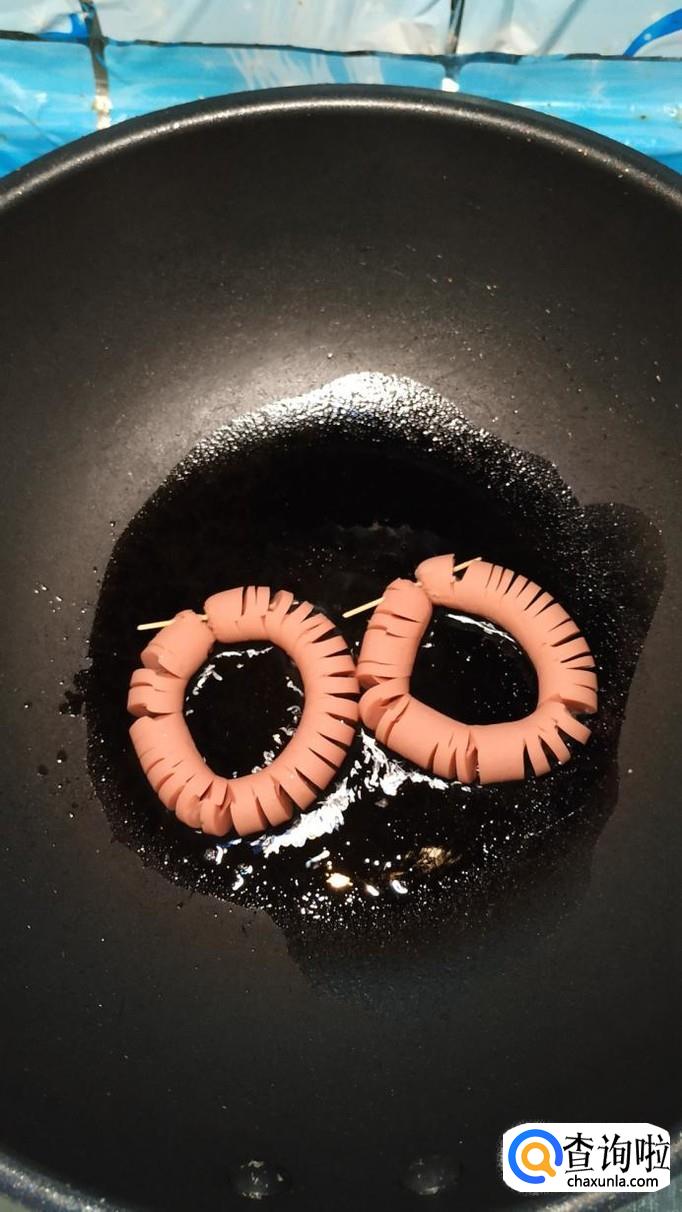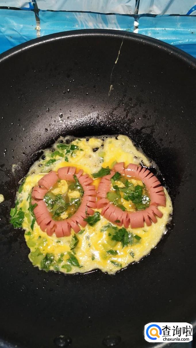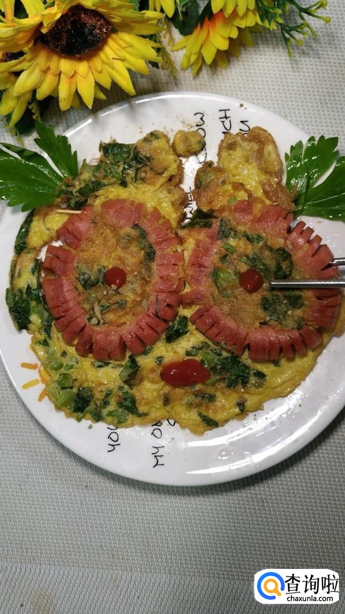 用番茄酱在火腿的中间,点一下,做出眼睛和嘴巴,看上去,像戴上眼镜的卡通头像,小朋友们看了,特别喜欢。
