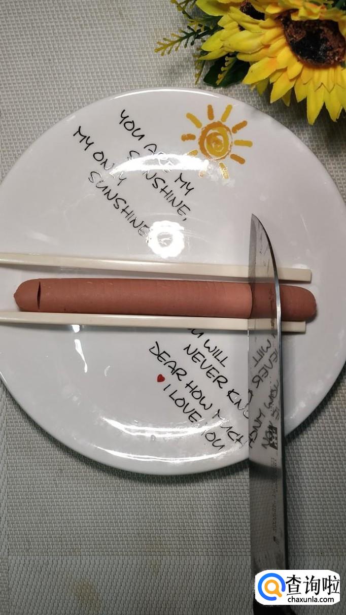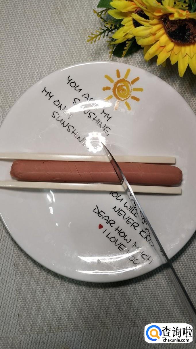 准备一根火腿肠,去除外衣,然后两边各垫一根筷子,先直刀切,然后将火腿肠反过来,再斜刀45度切一下。