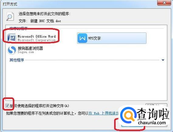 出现“打开方式”选项框,如图所示,我们在推荐的程序中选择“WORD”,然后勾选“始终用程序打开这种文件”,点击确定。