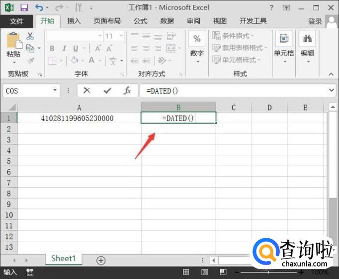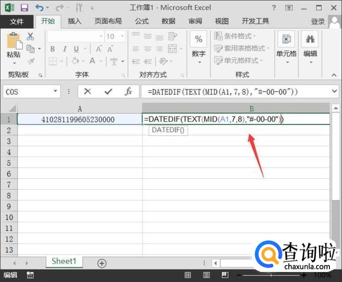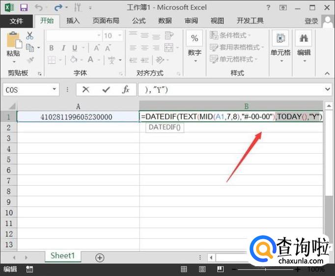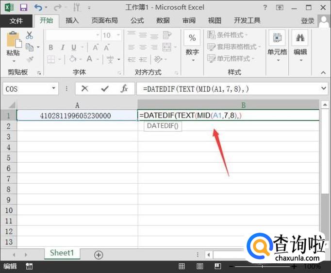 打开excel之后我们在单元格内输入身份证号,然后在选择单元格输入=DATEDIF()函数,如图所示: