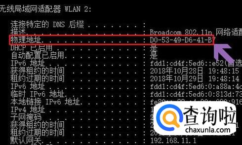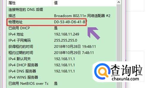 点击回车以后,在列表中的“物理地址”后面对应的就是网卡地址了,如下图所示...