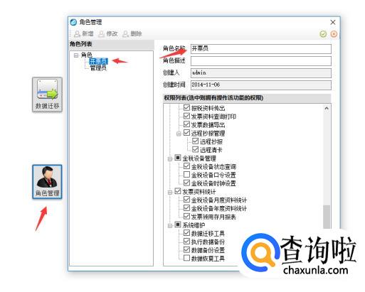 点击菜单栏“系统维护/用户权限设置/角色管理”,可增加另一个 “开票员”(注:管理员和新增开票员不能为同一个人)。