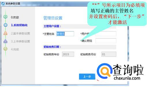 设置主管姓名(主管姓名可设为开票员姓名)和密码“123456”,带*项为必填项目(下同),新密码需要输入2次,输入完成单击【下一步】。