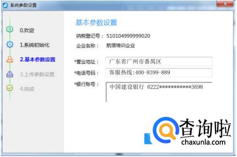 设置基本参数:营业地址、电话号码、银行账号等(中间不能敲空格和回车键),输入完成单击【下一步】。