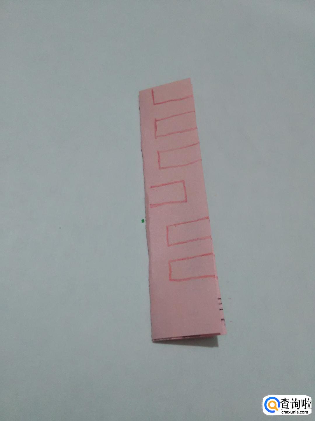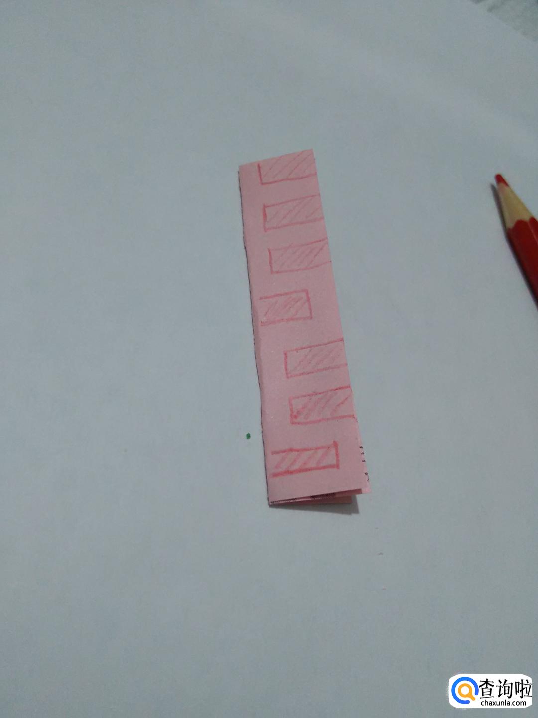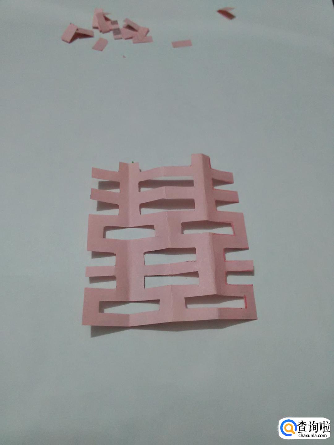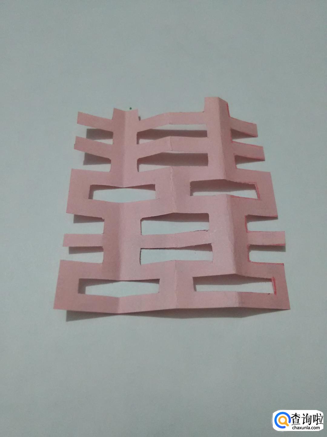 把彩纸左右对折两次后,用笔在彩纸上画出六个长方形,然后把长方形画上阴影,再用剪刀把阴影部分剪掉,打开就是一个双喜字,下面就来剪双喜字。