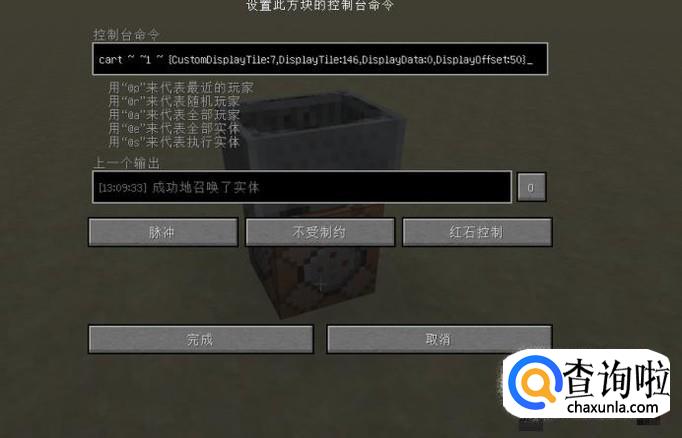 这其实是用到了上面所说的DisplayOffset,CustomDisplayTile和DisplayTile,这三个NBT的作用,从左到右依次是:控制方块距离矿车有多远,控制方块是否在矿车中显示,控制矿车中显示的方块。