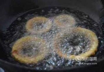 在锅中放入食用油,油热后,将蘸好面包糠的洋葱圈放入油锅中,中火炸至金黄色,就可以捞出来了。金黄酥脆,特别香。