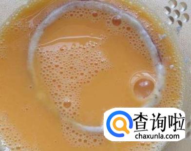 将入味的洋葱圈放进蛋液中,蘸一下。