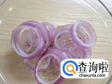 将洋葱圈放在小盆中,放上盐和白胡椒粉,拌匀。