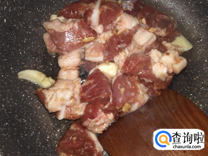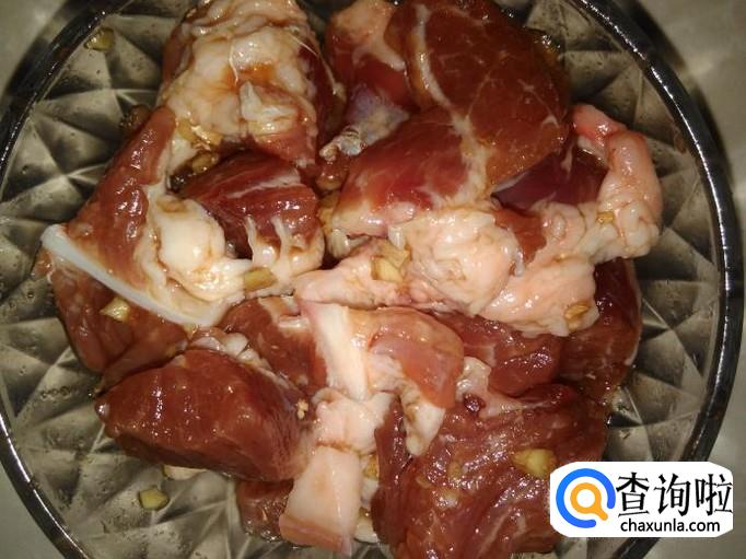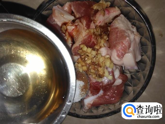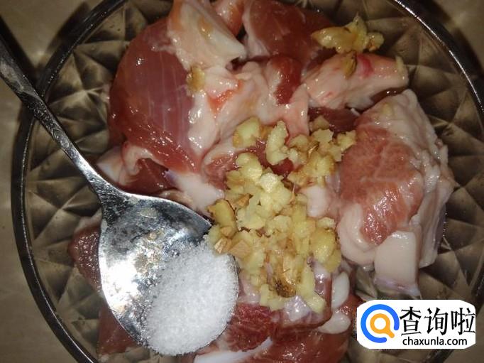 把猪肉切成厚片,然后加适量的盐、姜蓉。