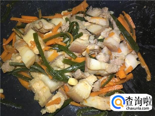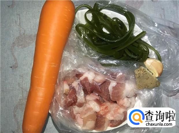 五花肉、海带丝、胡萝卜、姜、蒜头、花生油、酱油、蚝油、盐、料酒