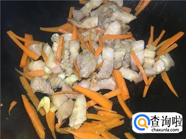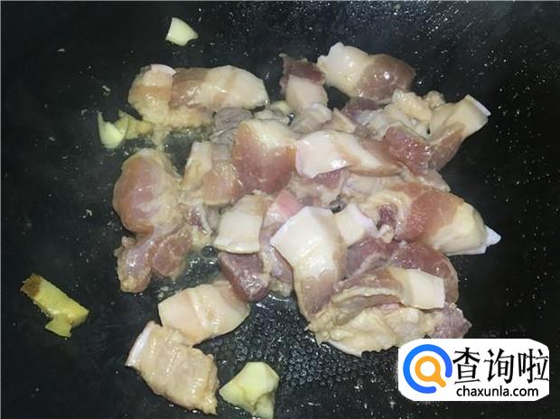 热锅下油,放入姜蒜,煸出香味后,再把腌制好的五花肉倒入锅中,因为五花肉腌制的时候已经下了盐,所以炒的时候不需要额外加盐了。