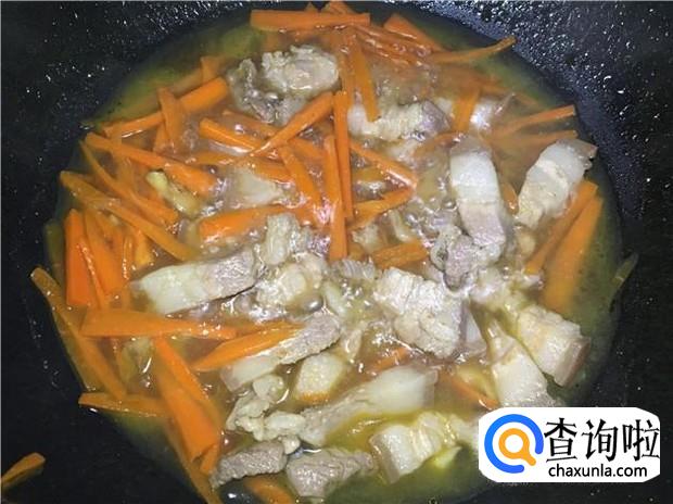 把五花肉爆炒八分钟左右,再把萝卜丝倒入锅中,翻炒均匀,加入少许清水,盖上锅盖焖五分钟。