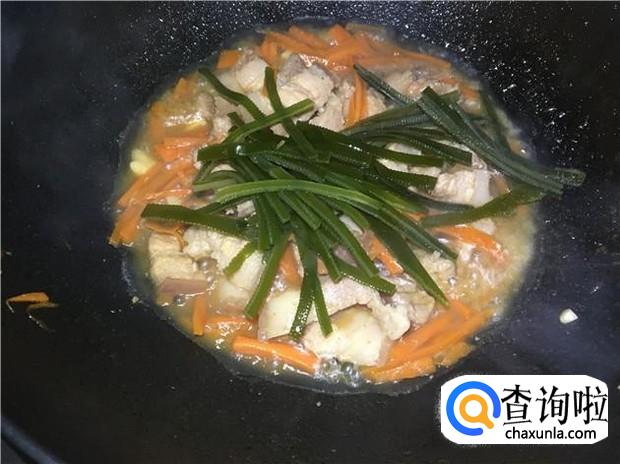 焖到快收汁的时候,把海带丝也一起倒入锅中,翻炒几分钟,海带丝比较容易熟,不需要炒太久。