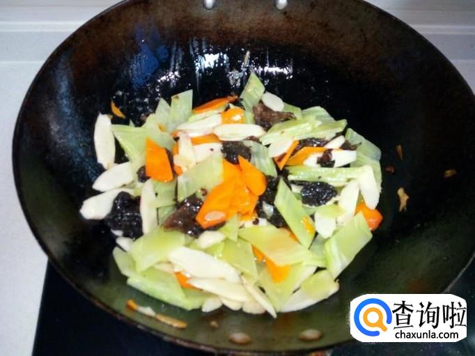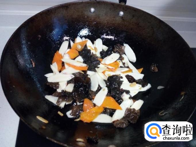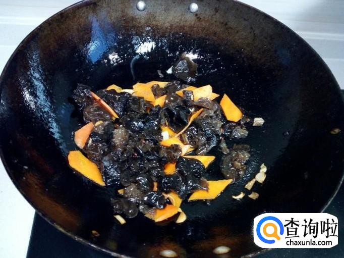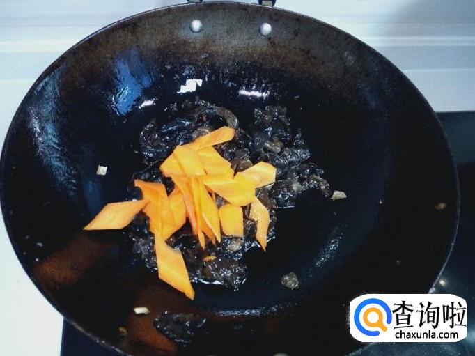 锅内放入油加热,油热后放入花椒,葱,姜,蒜,爆锅,放入木耳翻炒。木耳炒至变软透亮,放入胡萝卜片翻炒。
