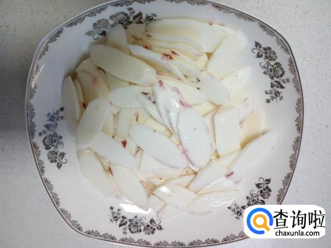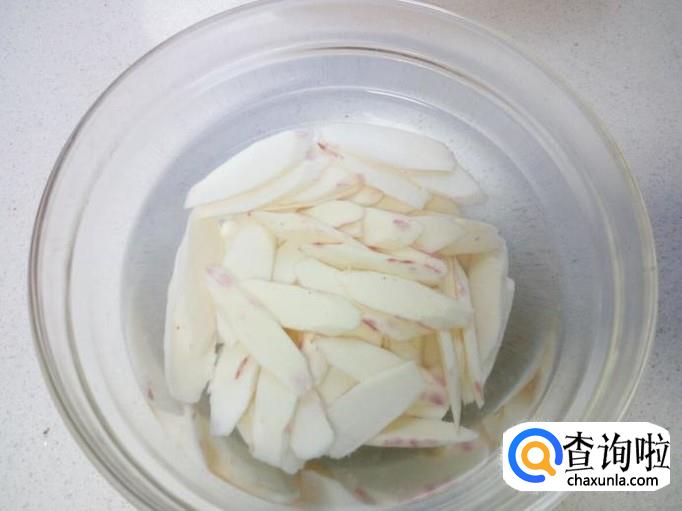 山药去皮,用水清洗干净,切成薄片,然后放入水中浸泡一下,再用清水投几遍,控干水分,备用。