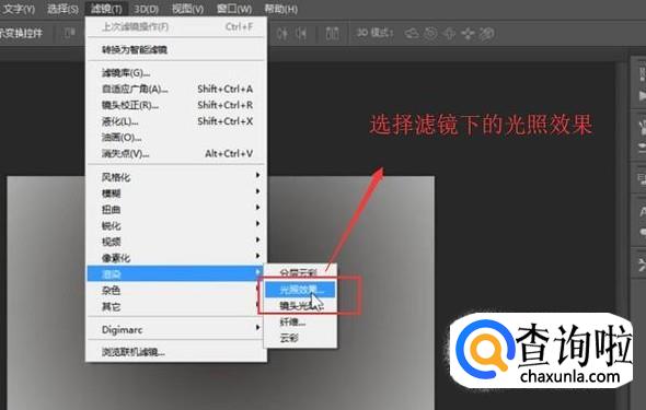 接下来点击顶部的滤镜菜单,然后选择渲染下面的光照效果,如下图所示