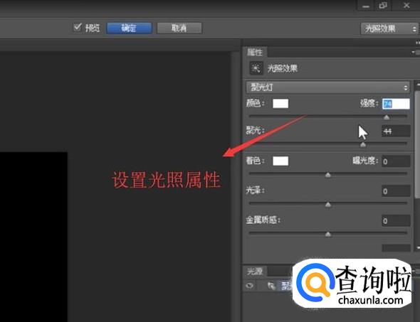 然后工作区的右侧就会出现光照效果的属性面板,我们只需要设置光照的一些属性即可,如下图所示