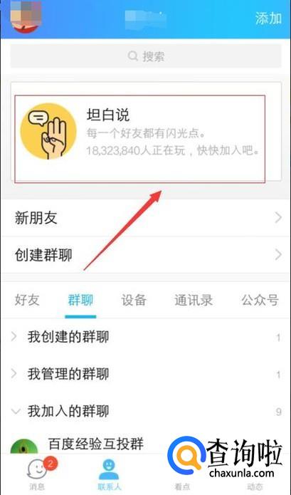 进入qq联系人,我们会看到坦白说,点击进去;(一般要是最新版本的qq)