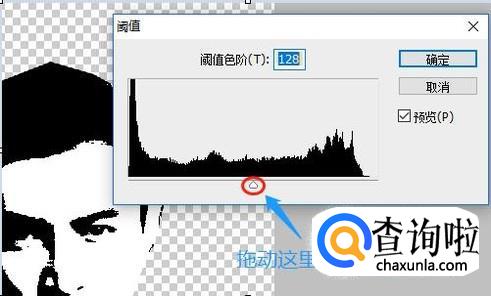 我们可以自由设置阈值的大小,不同的照片阈值设置值也不同,目前这张头像的阈值我们设置为128,然后点击确定;
