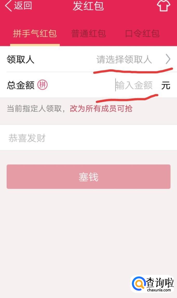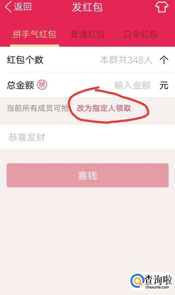 拼手气红包和普通红包均可给指定人发红包!
