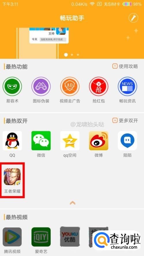 在选择修改完成之后回到应用的首页,打开最热双开中的王者荣耀,记住想要有效果一定是要在畅玩助手中打开游戏。
