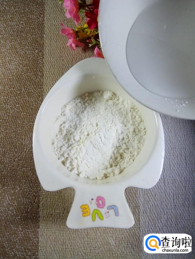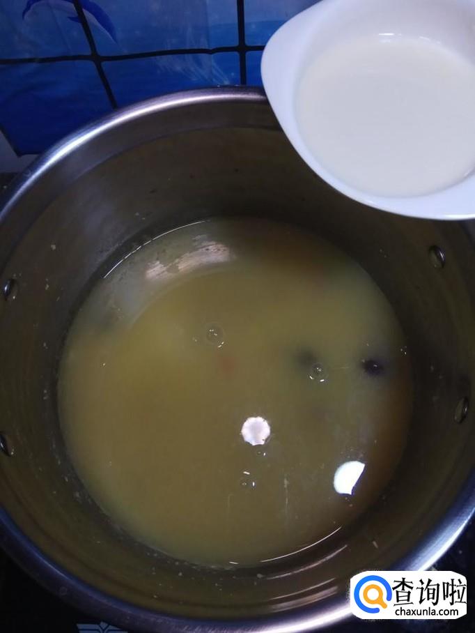 碗中加入适量淀粉,适量面粉,可以按照1:1的比例,混合一下,然后加入清水,搅拌成面糊,将面糊倒入锅中,搅拌均匀,继续将粥熬至浓稠。