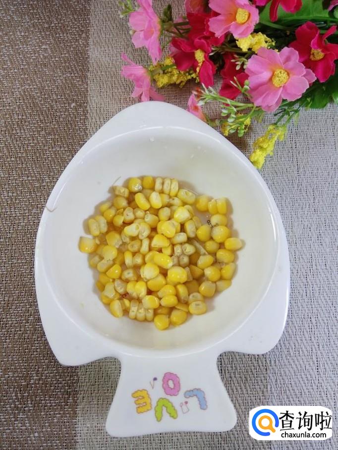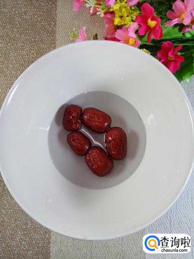 准备一个嫩玉米,取出适量,用手剥成粒,放入盘中备用,再准备适量红枣,用清水泡一下。
