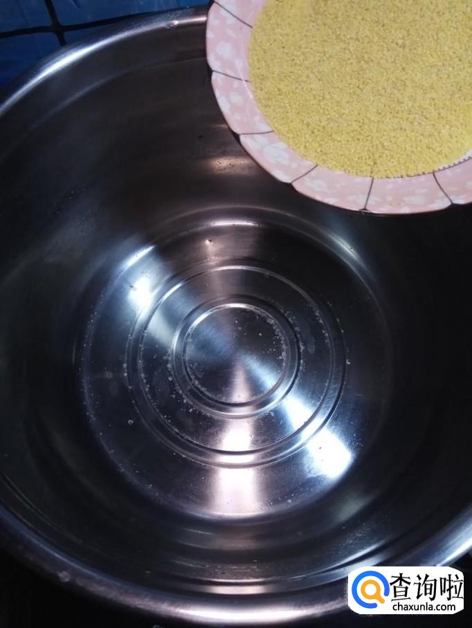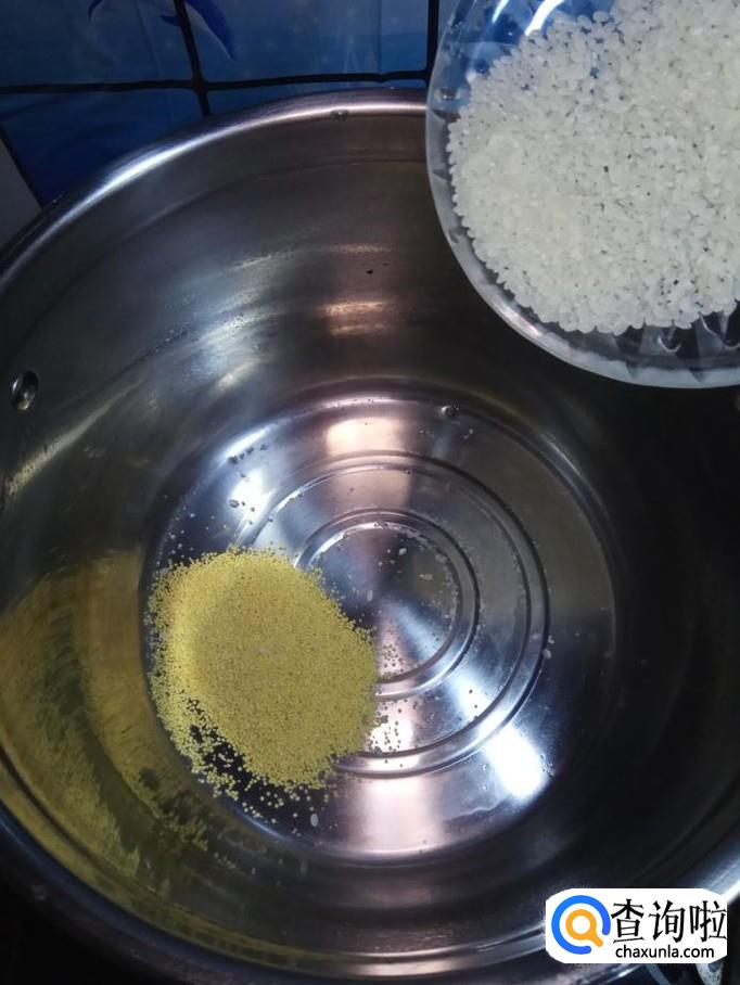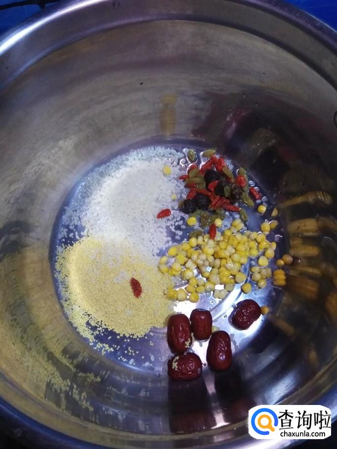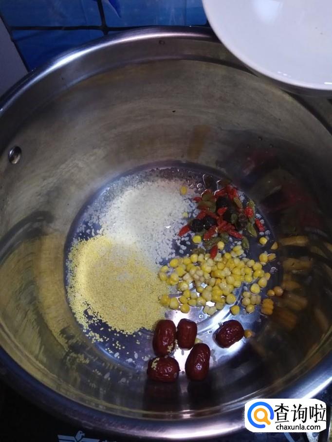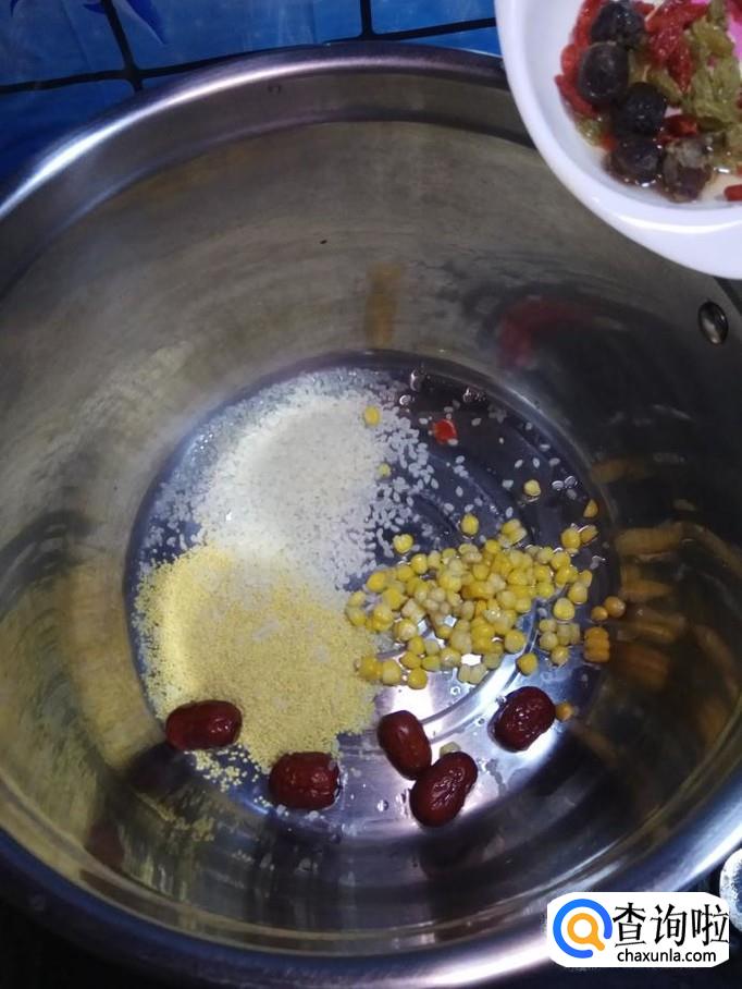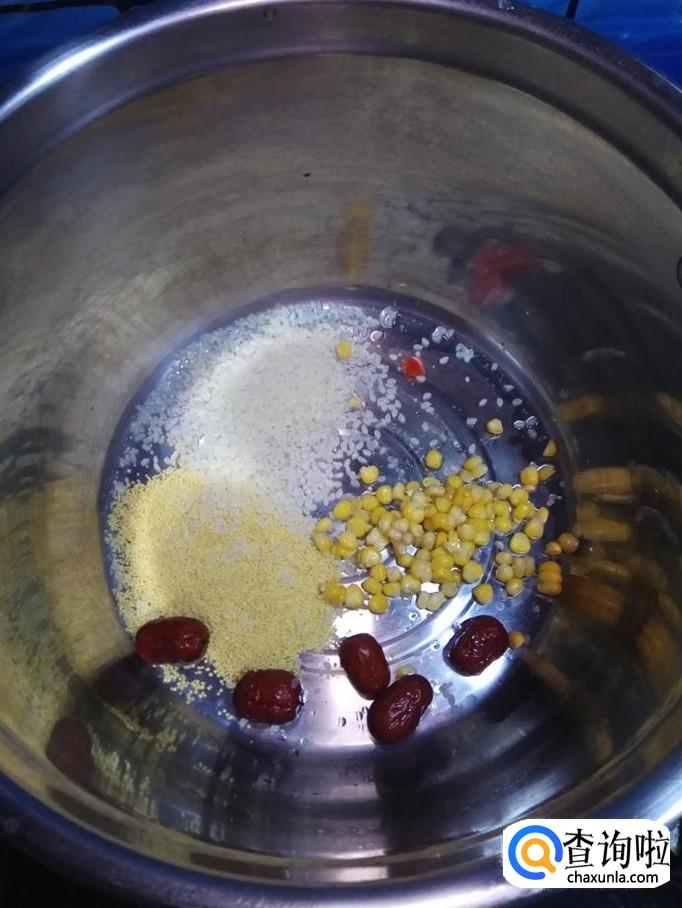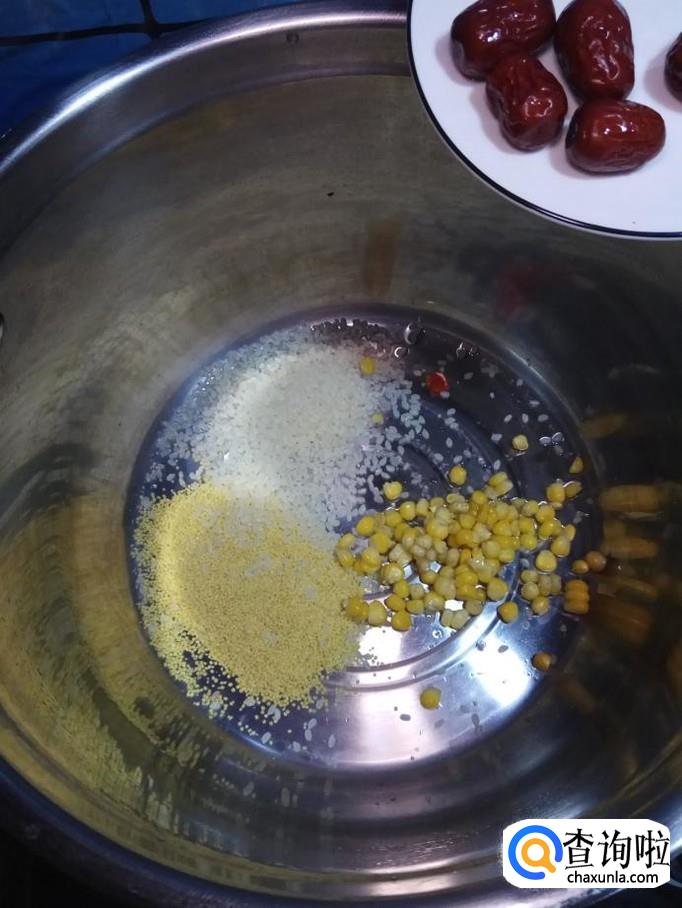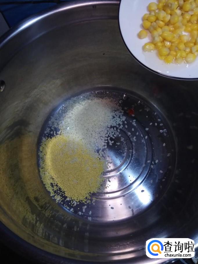 将小米和大米分别倒入锅中,然后将玉米粒也倒入锅中,玉米粒是粗粮,可以增加汤粥的营养。