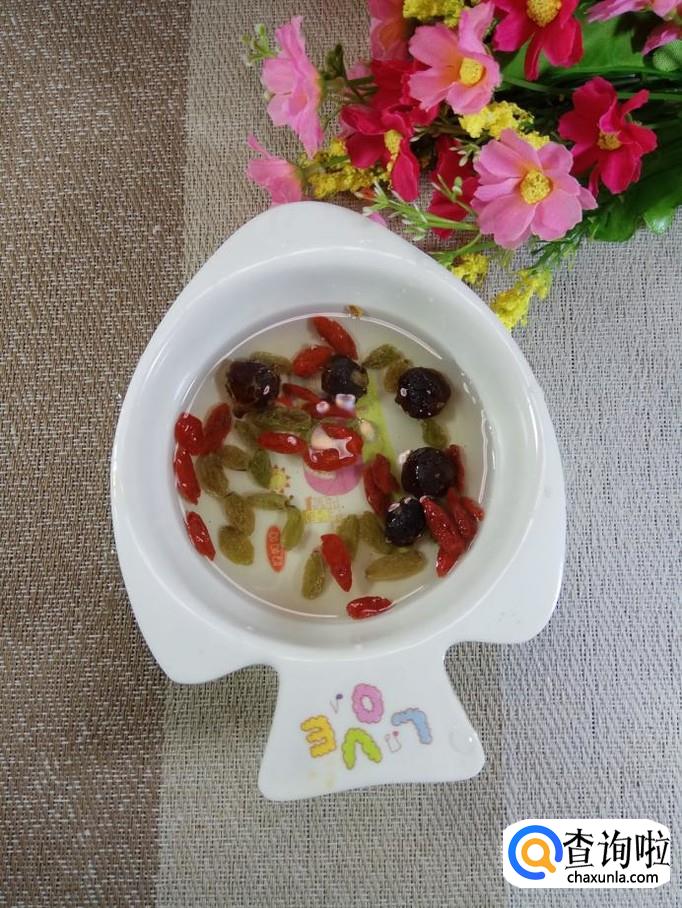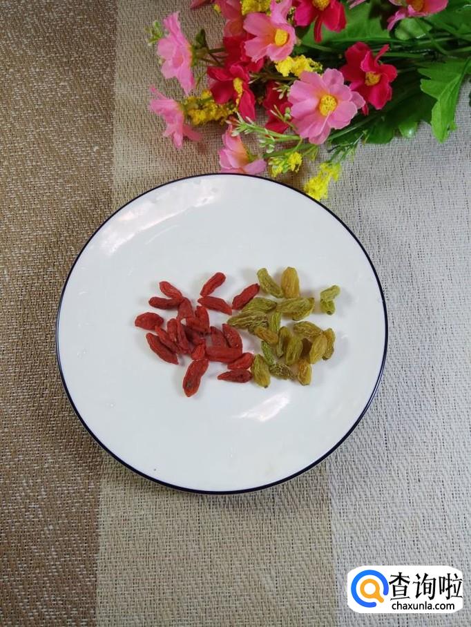 将桂圆剥去外皮,再准备枸杞子和葡萄干,和桂圆一起泡一下。