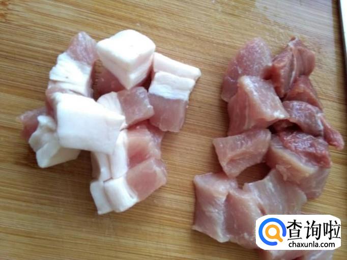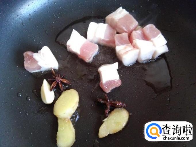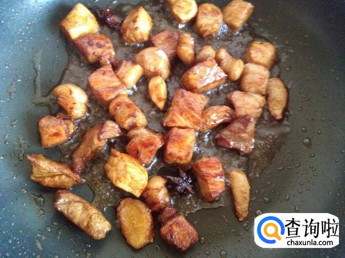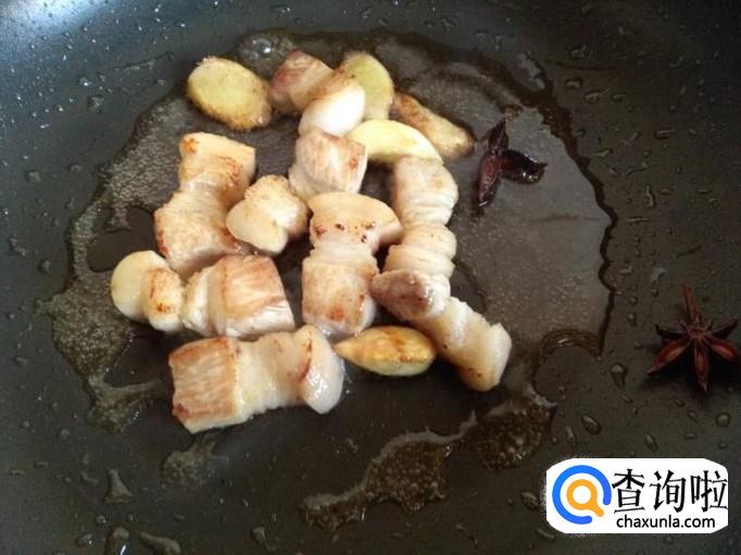将肥肉放入锅中煸炒出油脂,炒至两面微黄就可以了