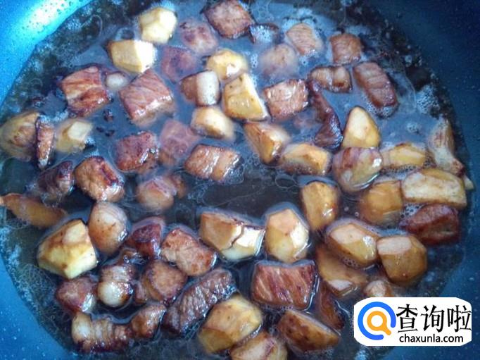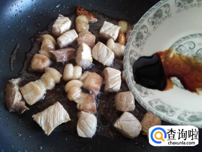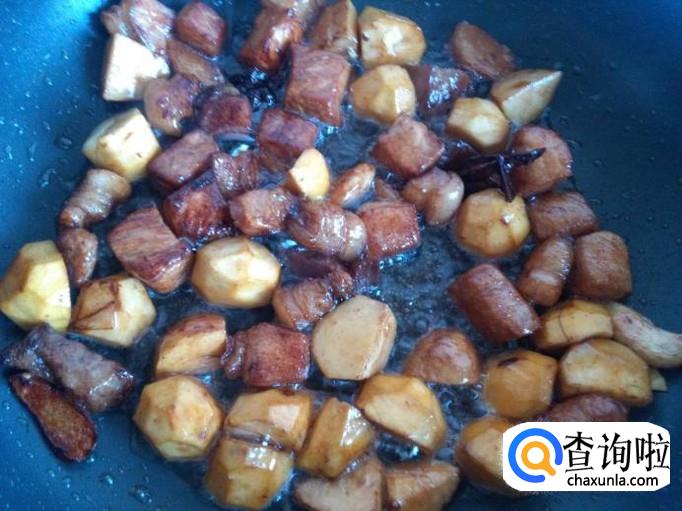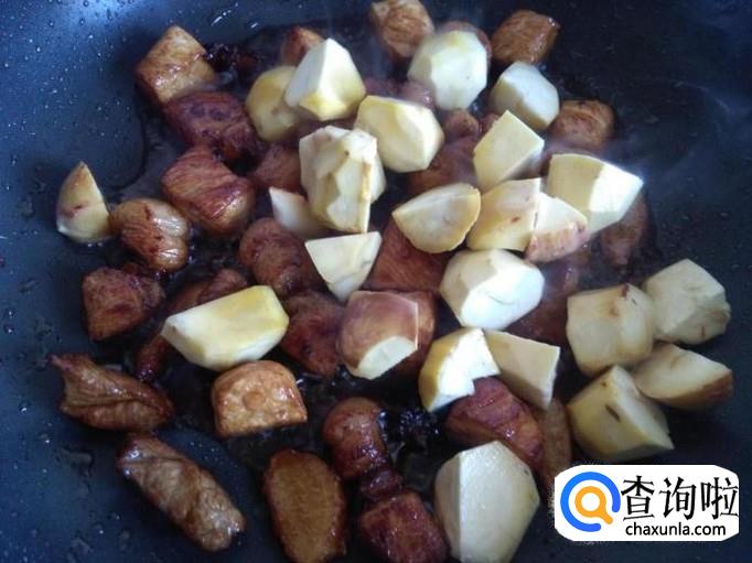 将板栗倒入锅中,中小火翻炒,让板栗吸收猪肉的油脂
