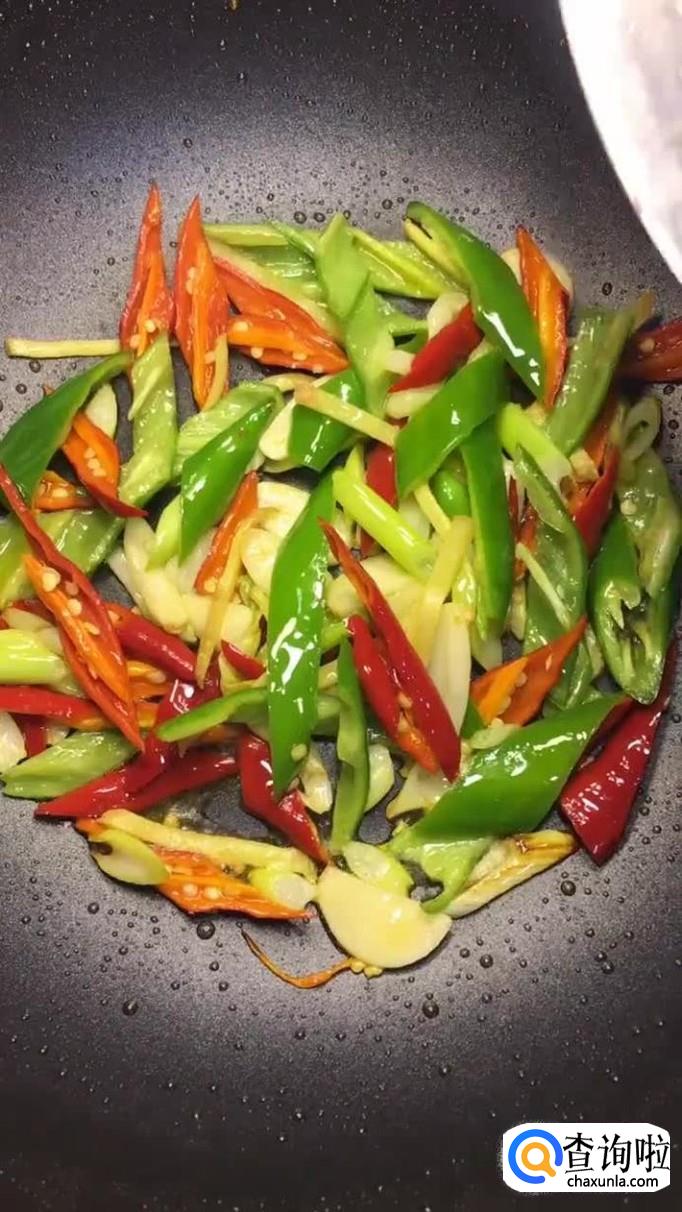 接着往锅中加入葱姜、红绿辣椒爆香,如下图所示。