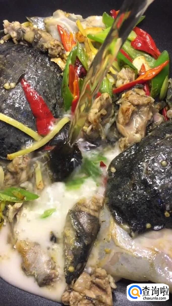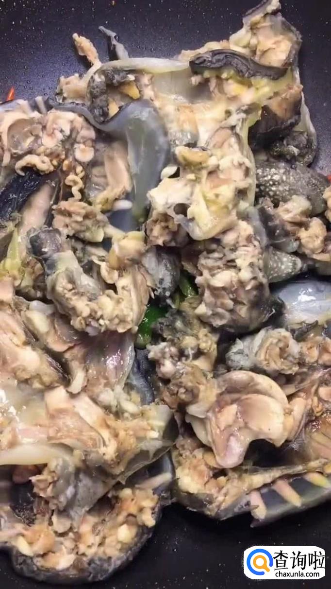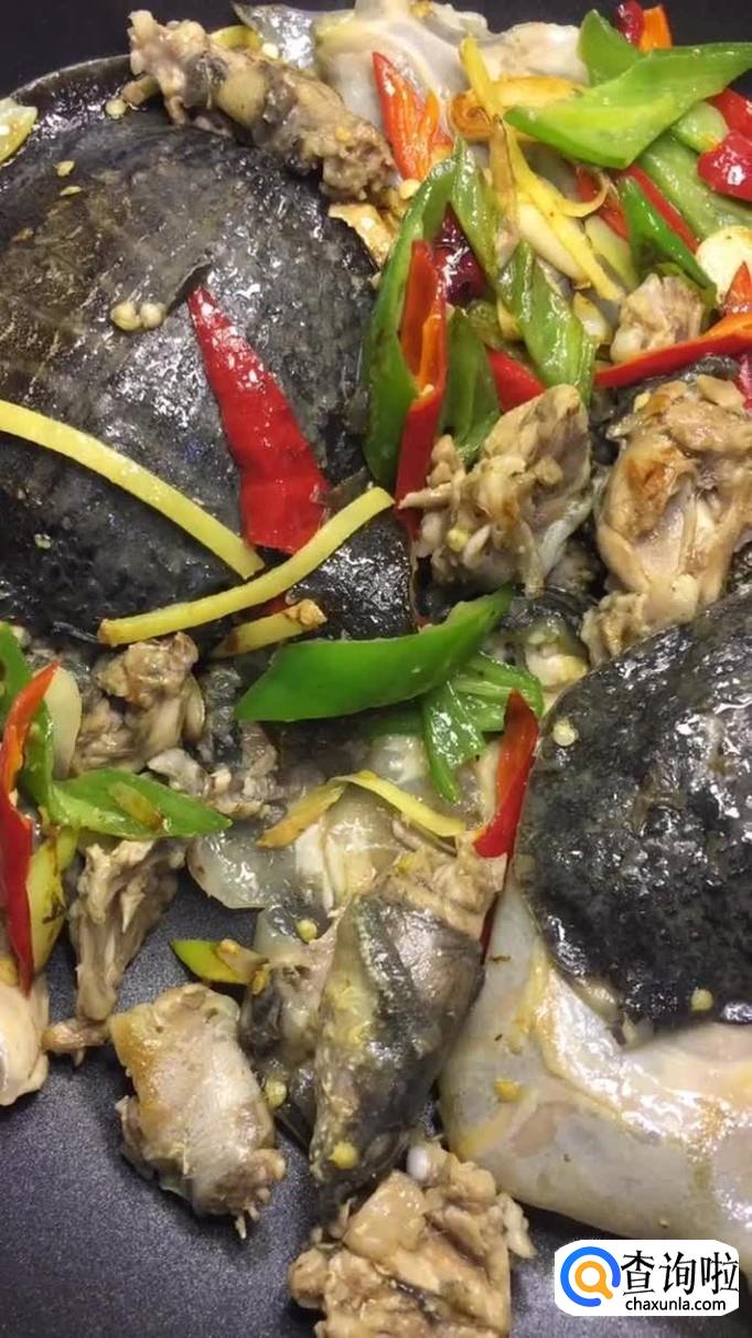 然后倒入甲鱼翻炒三分钟,如下图所示。