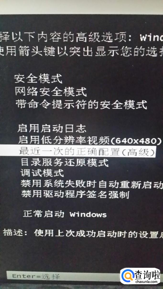 如果是对系统进行了某些改动造成系统崩溃,可以开机按F8后选择“最近一次的正确配置”,有时会解决问题。