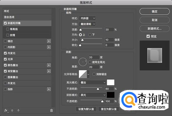 接着再添加一个内斜面样式,雕刻清晰方法的斜面浮雕,深度20%,大小10,角度20高度20,叠加模式的白色高光不透明度80%