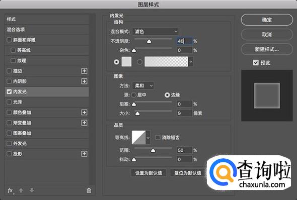 接着双击智能对象图层进入图层样式界面,添加滤色模式的内发光,不透明度40%,大小9,品质等高线范围50%