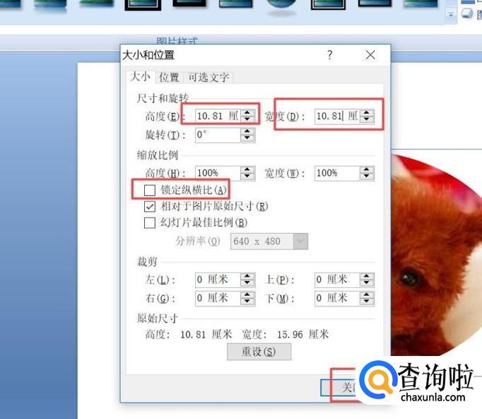 弹出的界面,我们将锁定纵横比的勾选给取消掉,之后我们将高度和宽度设置为一样的数值,然后我们点击关闭;